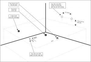– Ống dẫn cấp nước: đường ống Ø 21mm trên tường hoặc trên sàn cho mỗi loại vòi nước và đặt theo hướng từ dưới chân khi nằm trong bồn tắm để tránh tình trạng khi ngồi hoặ đứng sẽ va vào vòi cấp nước.